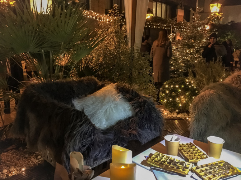 L’immense terrasse  de 1500 m2 des Jardins du Marais se transforme en jardin d’hiver douillet, avec plaids et peaux lainées, chauffé de novembre à fin mars et y abrite un bar à chocolat  à chaud.