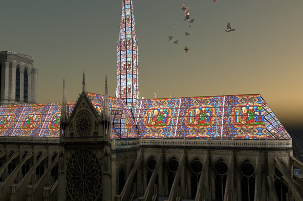 L’artiste Alexandre Fantozzi du studio Aj6 propose de rehausser la dimension sacrée de Notre-Dame en lui offrant un toit et une flèche complètement recouverts de vitraux dans les tons rouges. Il a partagé une représentation du projet éclairé la nuit.