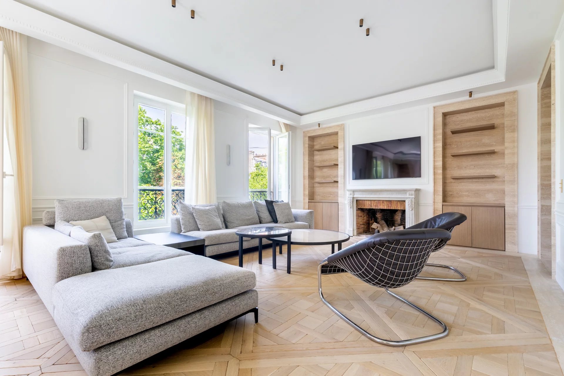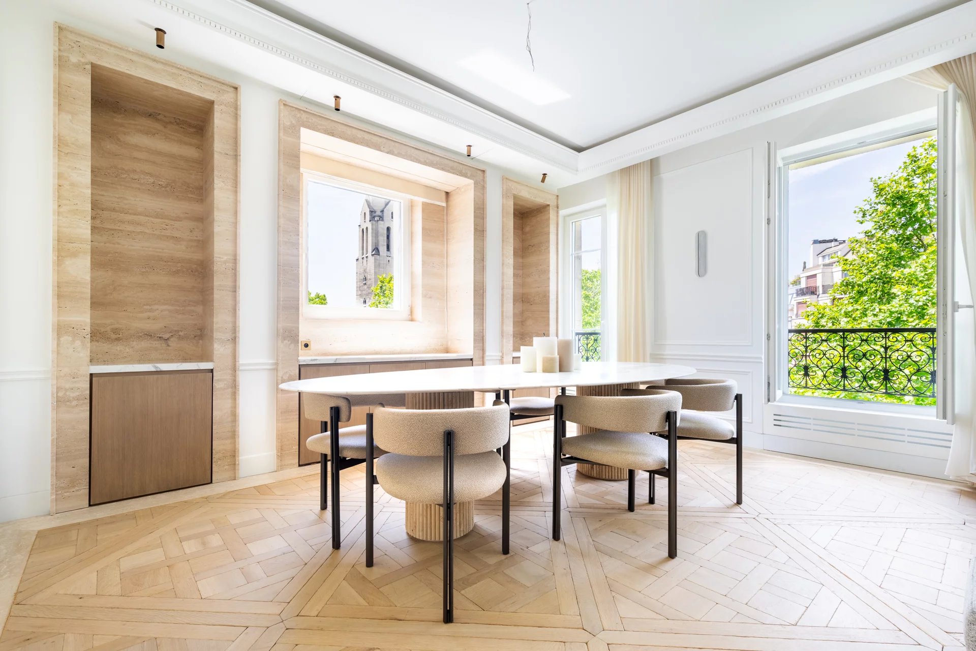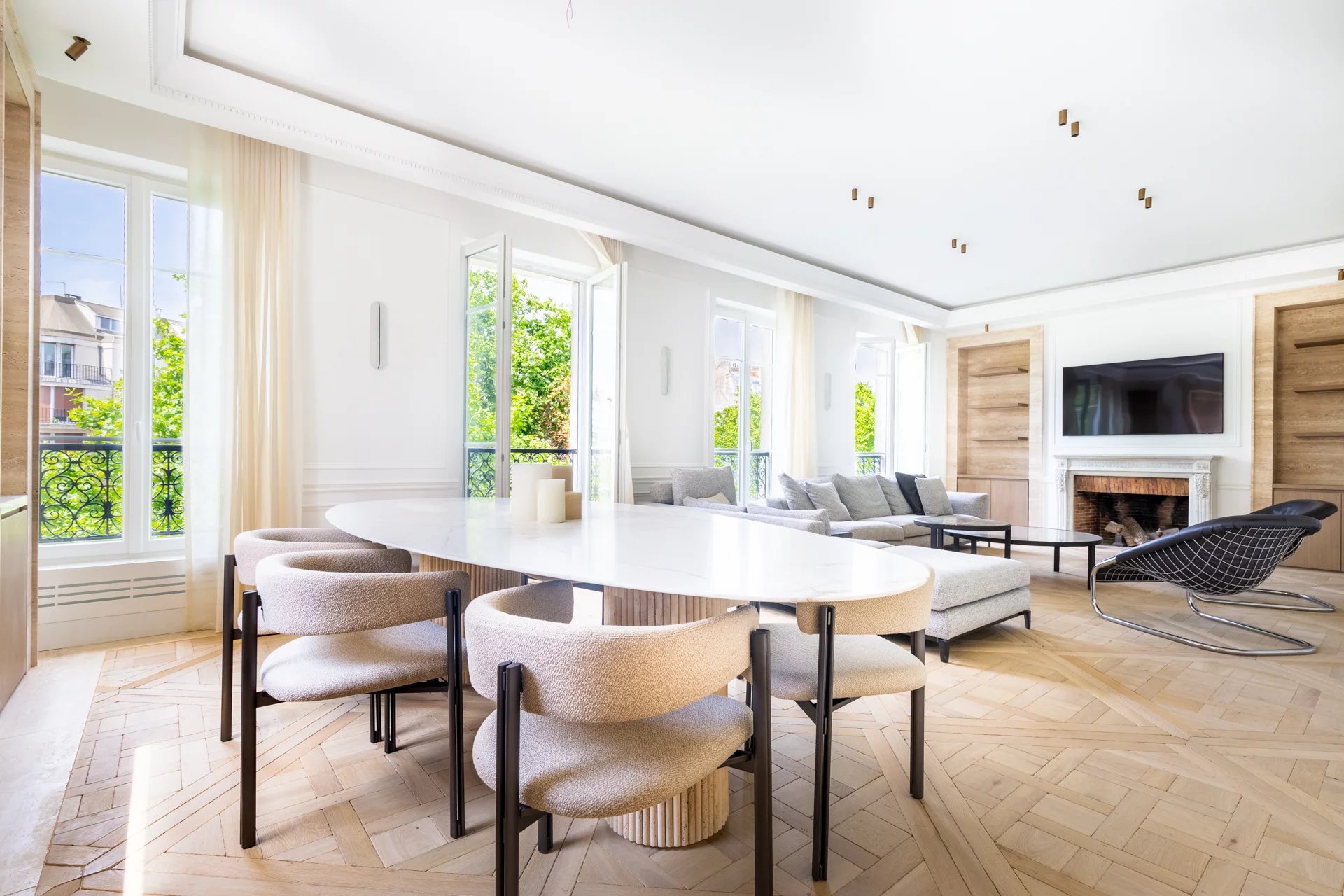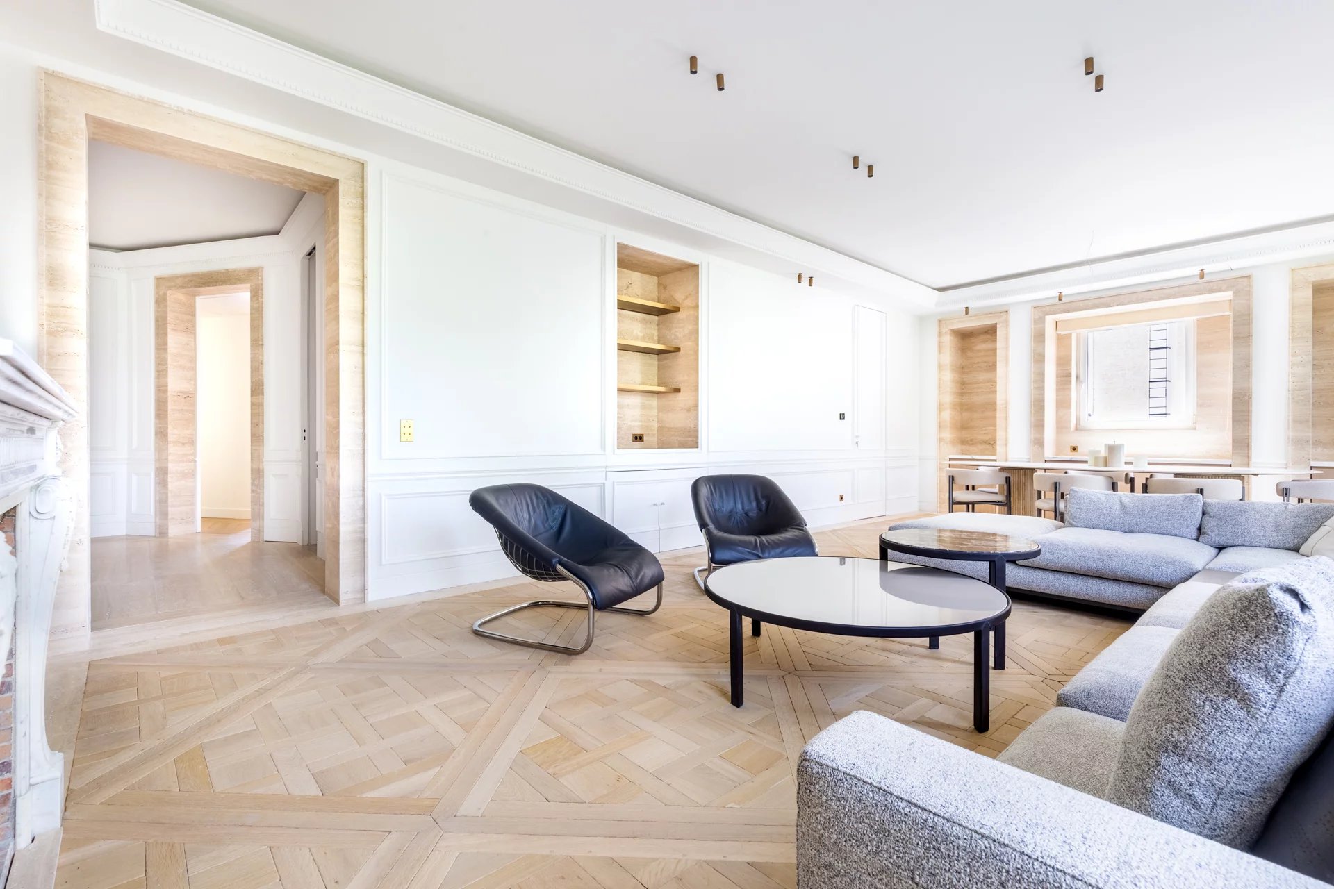 Situé Avenue Marceau à proximité immédiate de l'Avenue George V, de l'Avenue Montaigne et du Triangle d'Or, cet appartement d'exception de 142m² a été entièrement refait à neuf avec des matériaux nobles. Climatisé et vendu entièrement meublé, il est situé au 4ᵉ étage avec ascenseur d'un superbe immeuble Pierre de Taille du début du 20ᵉ siècle. Il se compose d'une entrée avec vestiaire et WC invités, une double réception avec un espace salle à manger, cuisine indépendante élégante et complètement équipée, trois chambres, en retrait au calme, deux salles de bains luxueuses en marbre avec leurs WC. Parquet Versailles, moulures d'origine, cheminées et finitions raffinées. Luminosité exceptionnelle avec de grandes fenêtres. Hauteur Sous Plafond de 3m. Un appartement qui allie le charme intemporel de l'architecture haussmannienne à une rénovation contemporaine de haut niveau, avec des matériaux de qualités.