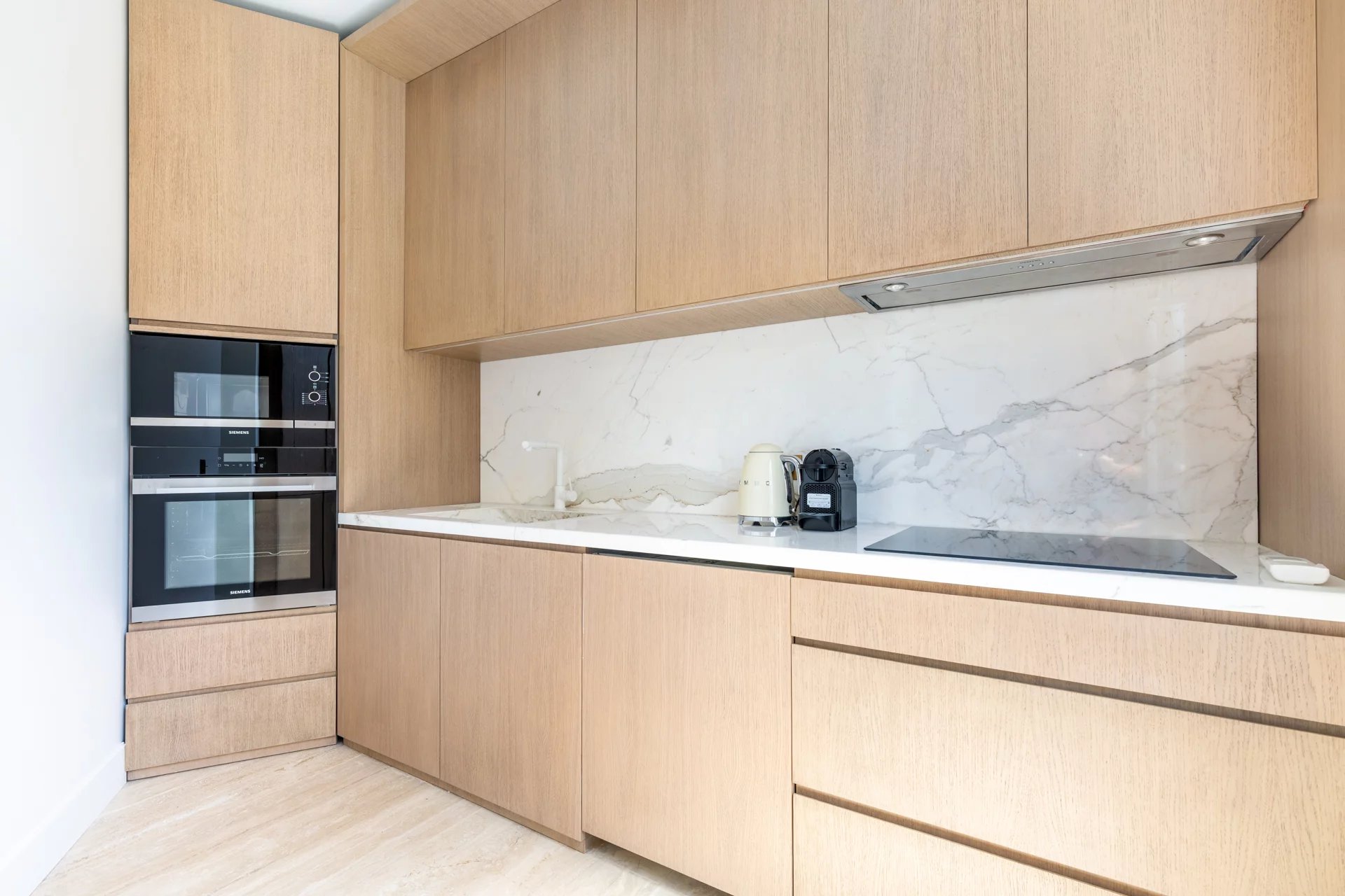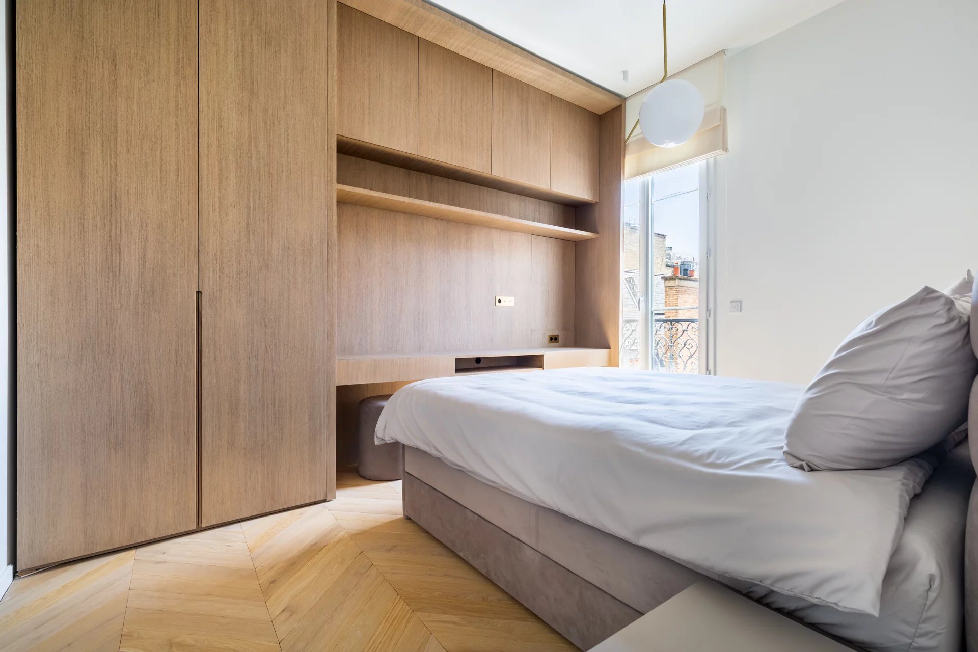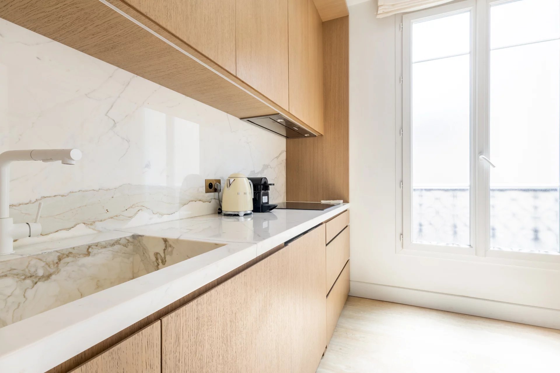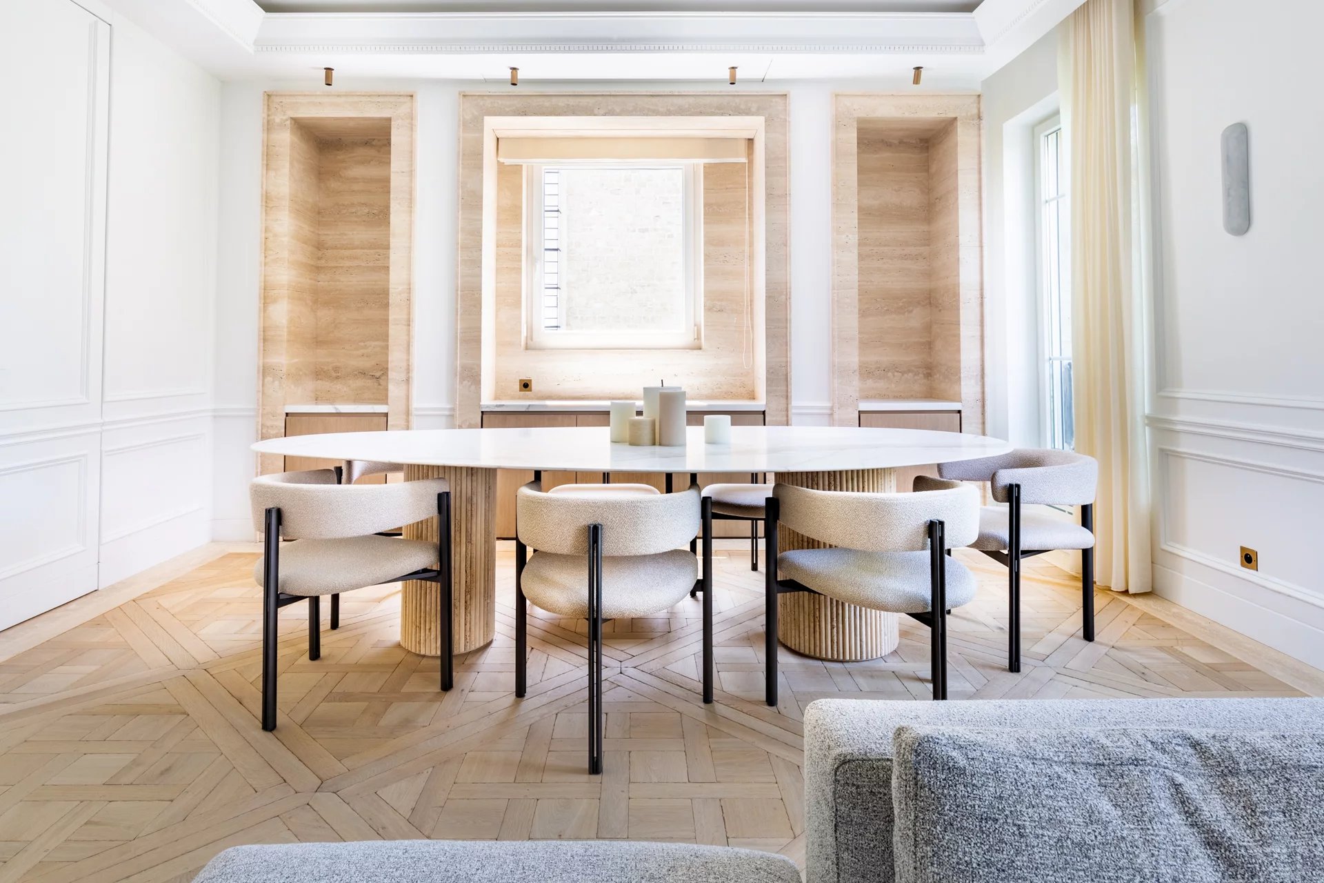 Situé Avenue Marceau à proximité immédiate de l'Avenue George V, de l'Avenue Montaigne et du Triangle d'Or, cet appartement d'exception de 142m² a été entièrement refait à neuf avec des matériaux nobles. Climatisé et vendu entièrement meublé, il est situé au 4ᵉ étage avec ascenseur d'un superbe immeuble Pierre de Taille du début du 20ᵉ siècle. Il se compose d'une entrée avec vestiaire et WC invités, une double réception avec un espace salle à manger, cuisine indépendante élégante et complètement équipée, trois chambres, en retrait au calme, deux salles de bains luxueuses en marbre avec leurs WC. Parquet Versailles, moulures d'origine, cheminées et finitions raffinées. Luminosité exceptionnelle avec de grandes fenêtres. Hauteur Sous Plafond de 3m. Un appartement qui allie le charme intemporel de l'architecture haussmannienne à une rénovation contemporaine de haut niveau, avec des matériaux de qualités.