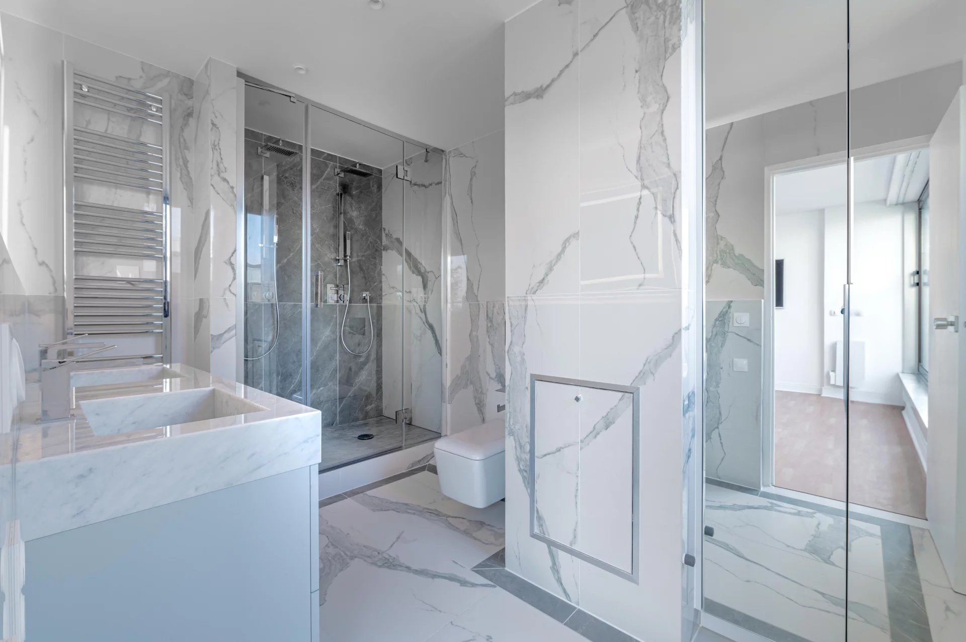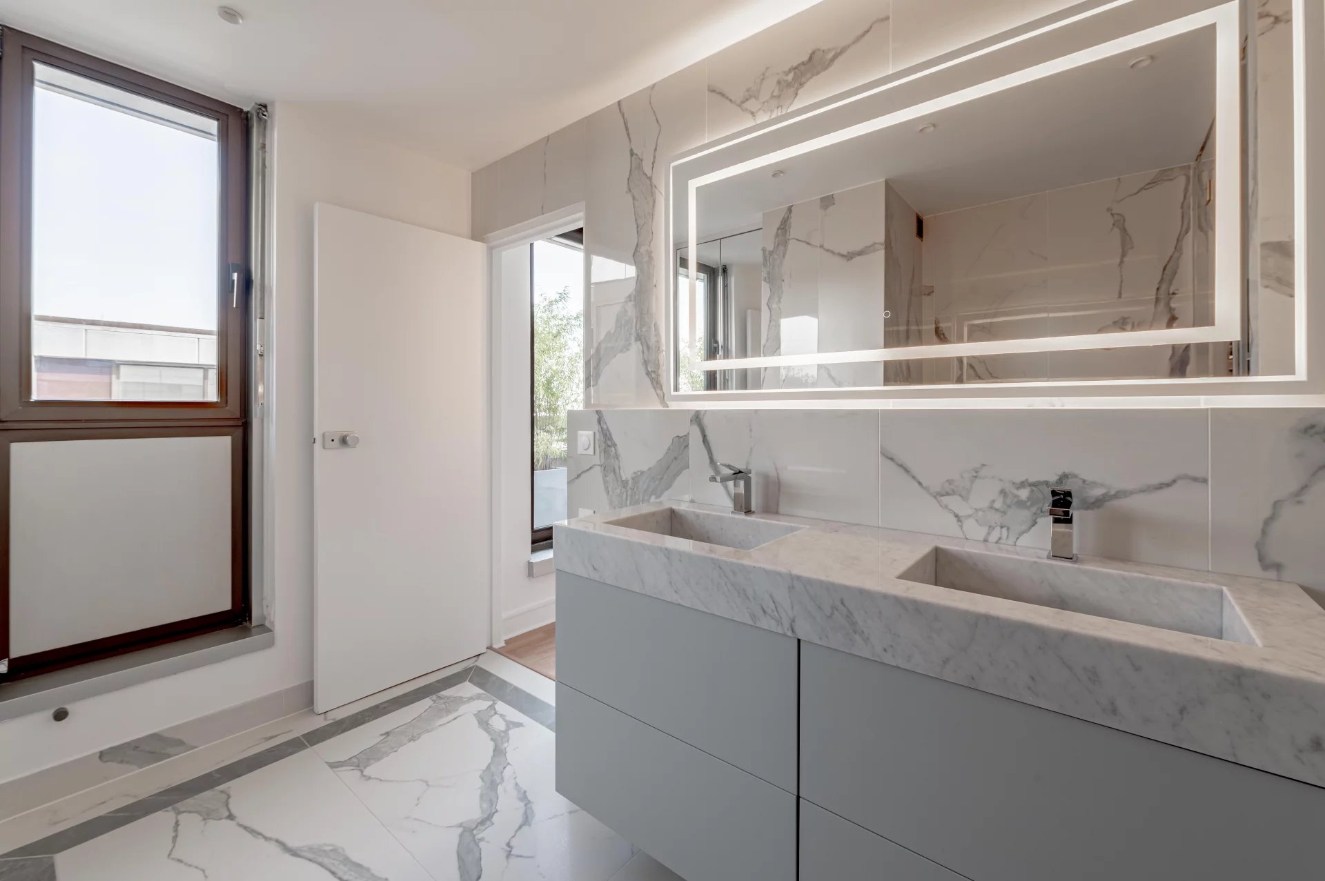 QUARTIER CHAMPS ELYSEES - AU CALME ABSOLU - DERNIER ETAGE - TERRASSE - VUE TOTALEMENT DEGAGEE. CLIMATISATION REVERSIBLE Rare appartement penthouse REFAIT A NEUF situé au dernier étage d'un immeuble récent à deux pas de l'avenue des Champs Elysées. Rénové par un architecte de renom, cet appartement de 51m² Loi Carrez bénéficie d'une grande terrasse de plain pied de 25m²! Idéal pour un pied à terre de luxe. Bordé par une longue terrasse des 2 côtés et baigné de soleil, il comprend un beau séjour avec baies vitrés et une cuisine ouverte entièrement équipée et aménagée avec des équipements de qualité, une suite parentale comprenant son grand espace de dressing et sa salle de bains spacieuse. Les pièces de vie donnent un accès direct à la terrasse. Profitez de son confort grâce à la climatisation et des volets électriques, garantissant une atmosphère agréable tout au long de l'année. Il ne reste plus qu'à poser vos valises.