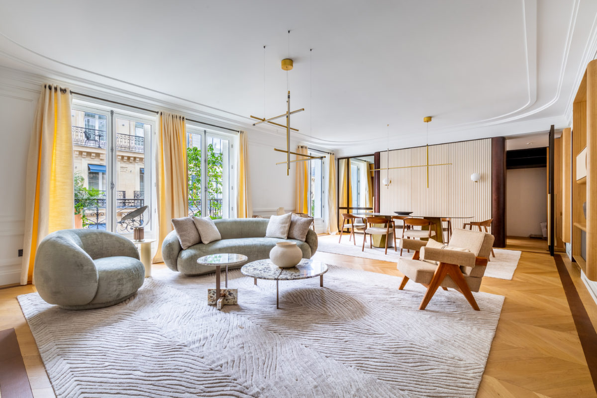 Le deuxième est un appartement familial de 185 m², entièrement rénové et décoré par l’architecte Vincent Lemaitre. Vendu meublé, son camaïeu de beige et son mobilier sophistiqué marient avec douceur et élégance l’esprit du contemporain au charme de l’ancien. Ses prestations sont exceptionnelles à la fois en termes de matériaux et de finitions. Il est non seulement climatisé mais aussi à la pointe de la technologie domotique. Seul sur le palier du 4ème étage d’un très bel immeuble haussmannien, il bénéficie d’un plan parfait et de larges balcons.