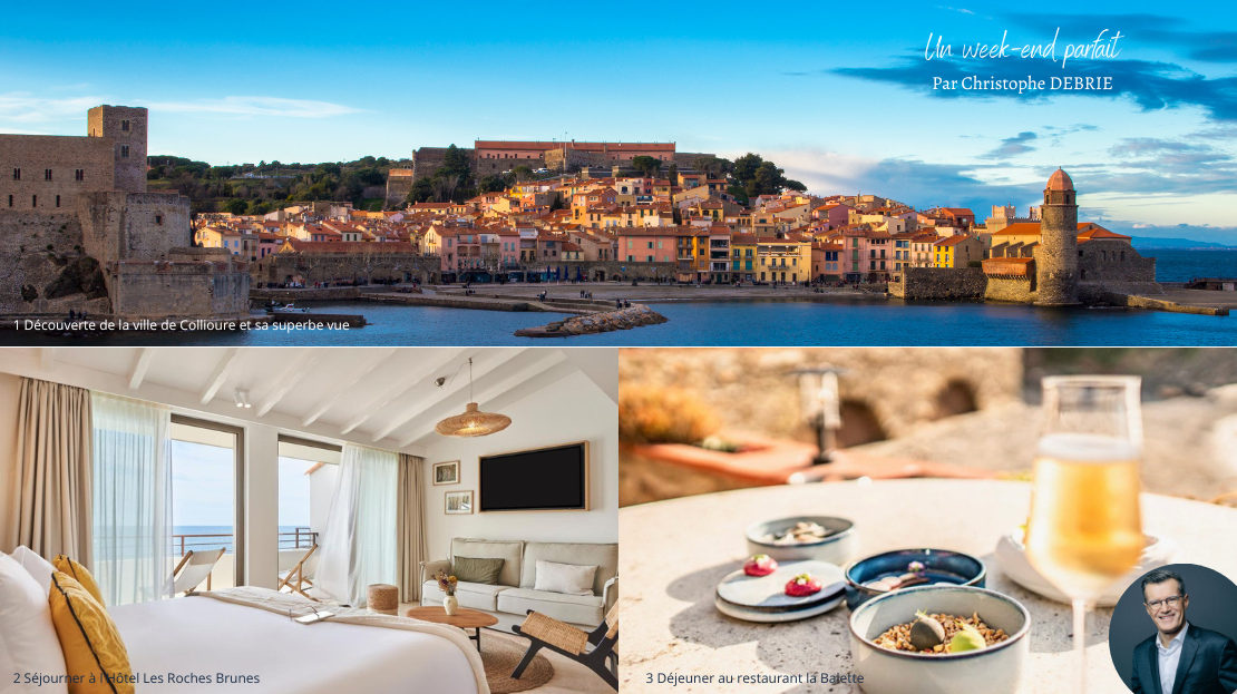 After a quick 25 km drive, we reach our hotel, a haven of peace and well-being, hidden from view in an exceptional location: the breathtaking view of the Mediterranean and Collioure village is truly unique. After dropping our suitcases in our room with a balcony enjoying a sea view, we head for the waterside terrace for dinner.