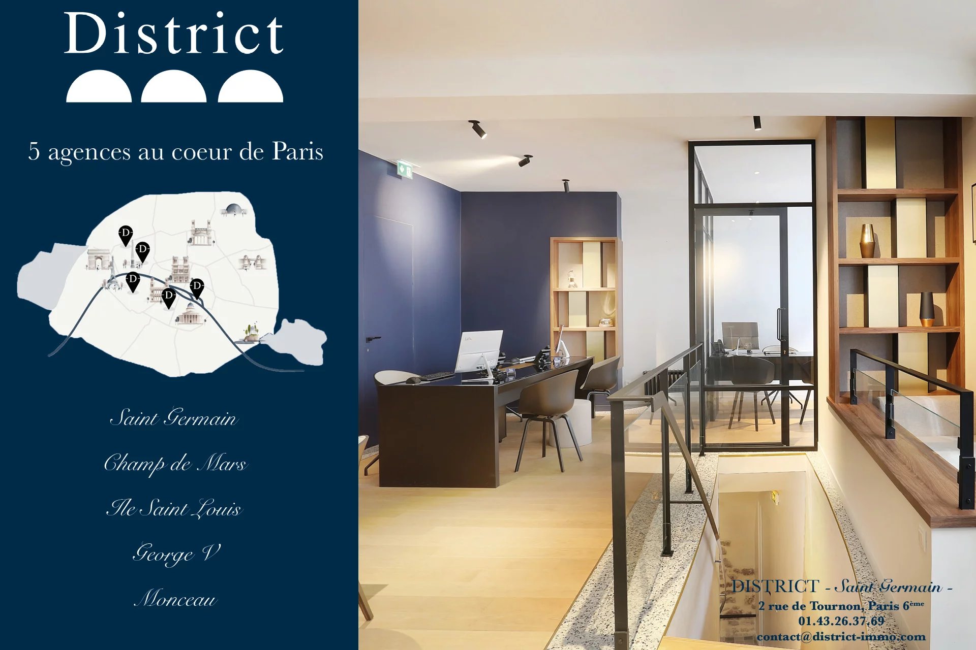 Odéon/Saint-Germain-des-Près. A 2-bed apartment in an exceptional location. 82.35 sqm of renovated living space as new. This delightful four-room apartment on the first floor of a fine early 19th century building features exposed beams and stone. It comprises a living/reception room, a dining room with a fitted and equipped open-plan kitchen, a bedroom with a shower room and a walk-in closet, a second bedroom with a shower room and fitted storage space, a utility room and a separate toilet. Cellar. A peaceful pied a terre in a prime location. The District group has 5 agencies in prime locations in the capital’s most prestigious neighbourhoods : Ile Saint Louis, Saint Germain des Prés, Champ de Mars, 8th District Golden Triangle, and Parc Monceau. Since 1997, we have been managing a carefully selected portfolio and offering the best assets on the market. Our services include the sale, acquisition, rental and management of real estate assets.