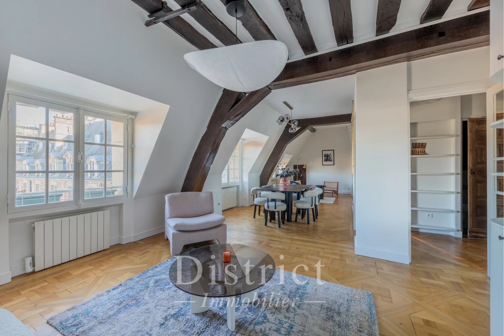 Historic Place des Vosges – A renovated 2/3 room duplex apartment This apartment oozing with period charm is on the 3rd and 4th floors of a fine early 17th century building facing historic Place des Vosges. Renovated throughout by an interior decorator, it offers 88 sqm of floor space and 61 sqm of living space as defined by the Carrez Law including a living/reception room and dining room featuring exposed beams and Versailles-style parquet flooring, an equipped kitchen, a shower room and a separate wc. The top floor comprises a spacious bedroom with a study area. A second bedroom would be possible. With 4 storage rooms. The apartment is in perfect condition and may be sold furnished. An ideal pied a terre in a prime location. The District group has 5 agencies in prime locations in the capital’s most prestigious neighbourhoods : Ile Saint Louis, Saint Germain des Prés, Champ de Mars, 8th District Golden Triangle, and Parc Monceau. Since 1997, we have been managing a carefully selected portfolio and offering the best assets on the market. Our services include the sale, acquisition, rental and management of real estate assets.