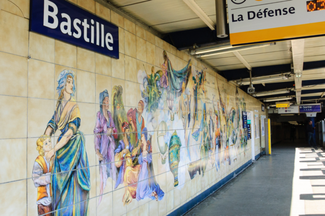 Les quais de cette station nous transportent dans un voyage à travers le temps où l’on peut voir une grande fresque en céramique sur les murs qui nous ramène 200 ans plus tôt. En effet, cette fresque a été réalisée en 1989 pour le bicentenaire de la Révolution Française par les artistes Liliane Belembert et Odile Jacquot. Elle relate les évènements de la prise de la Bastille sur 180m2.